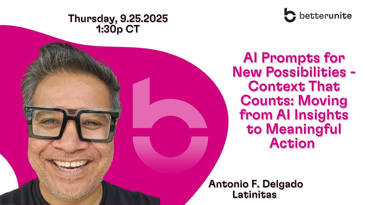 That’s exactly what Antonio Delgado, technologist, educator, and nonprofit strategist, shared in a recent episode of The 501(c) Drop, hosted by BetterUnite CEO and Co-Founder Leya Simmons. In this friendly, fast-paced conversation, Antonio showed how AI prompts — when infused with the right context — can help nonprofits move from simple insights to meaningful action.