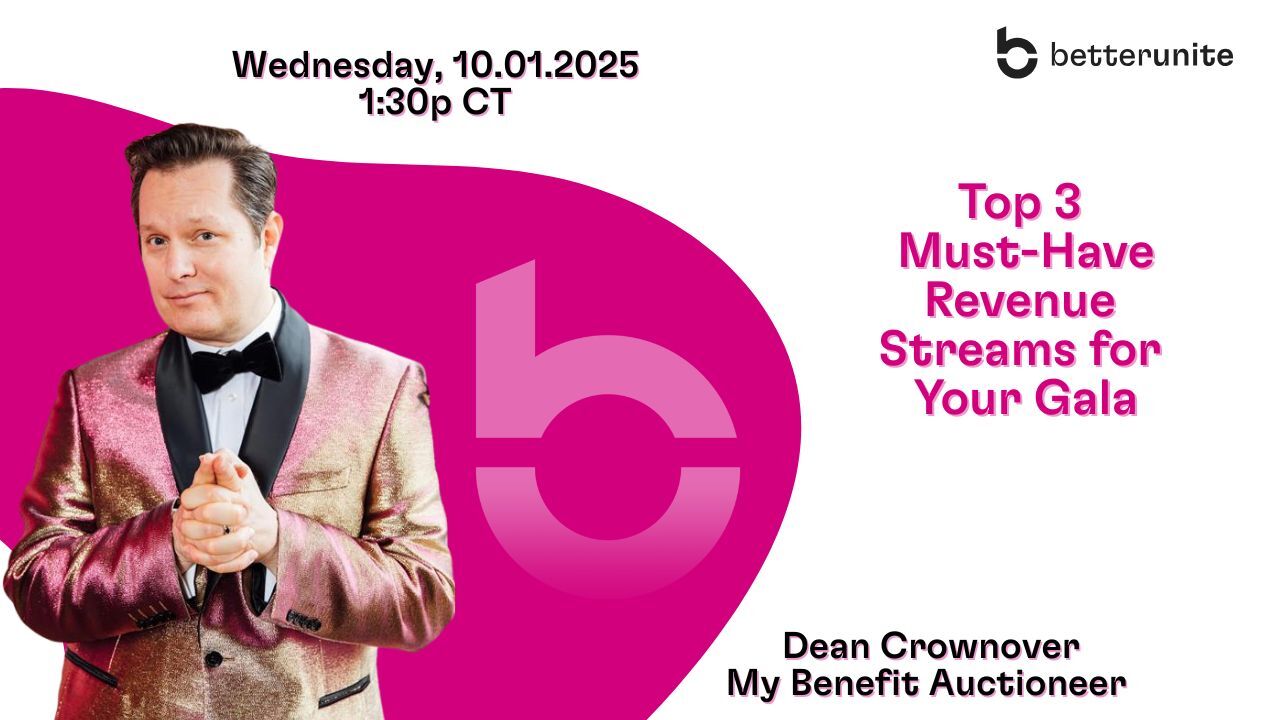 Discover the top 3 revenue streams for your gala — Paddle Raise, Live Auction, and Golden Ticket — with BetterUnite and benefit auctioneer Dean Crownover.